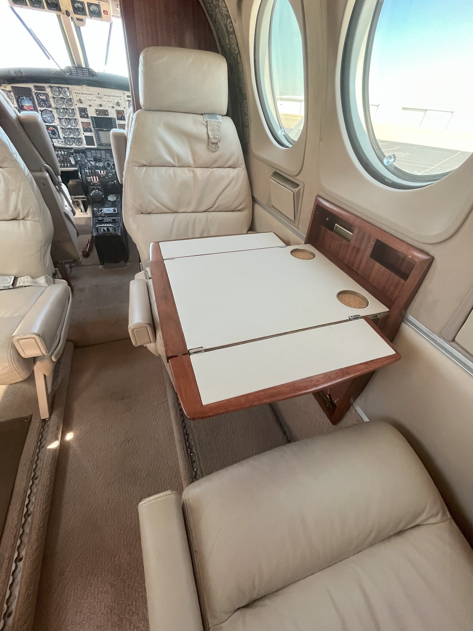 Executive/8 passengers, tan leather seats, tan carpet. Aft lav, cabinets, dividers, tables.