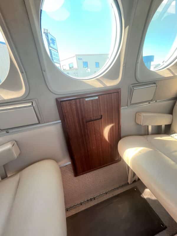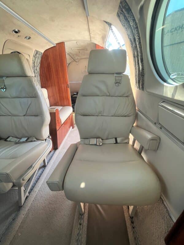 Executive/8 passengers, tan leather seats, tan carpet. Aft lav, cabinets, dividers, tables. Rated 7.