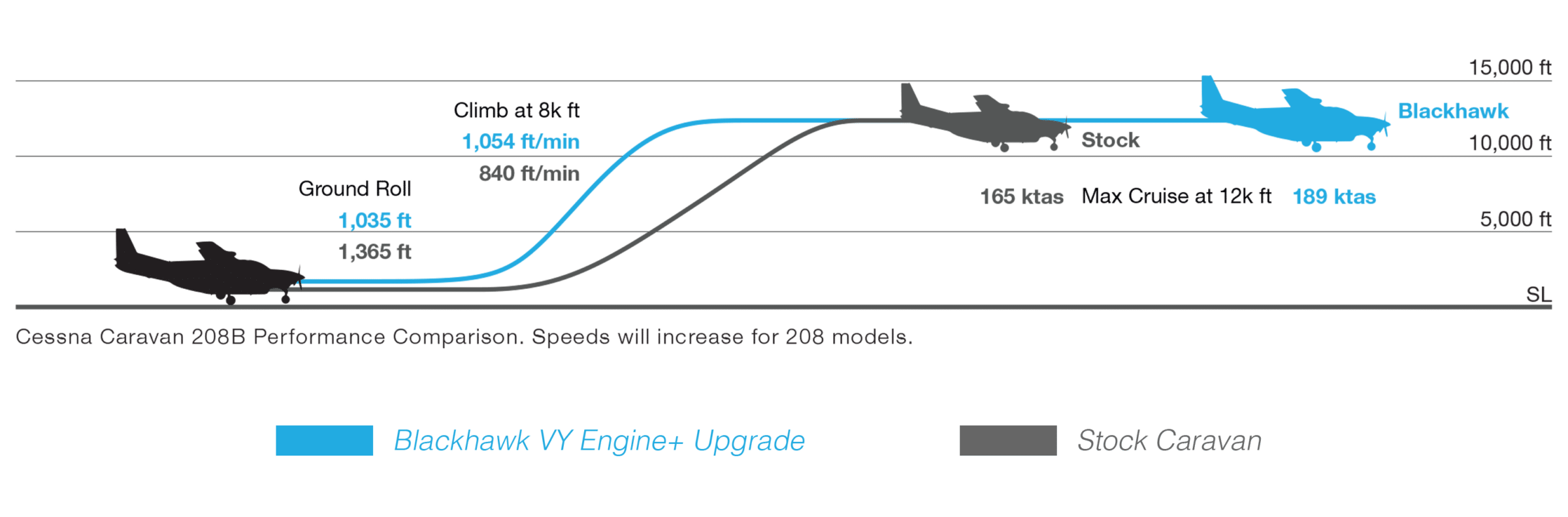 Multiply your power and revenue generation capability with the Blackhawk Vy Engine+ Upgrade and experience serious return on investment. The upgrade replaces your tired PT6A-114/114A engine with a factory-new PT6A-42A powerplant for like-new levels of performance and load carrying capabilities. Blackhawk makes it easy with a quick two-week, ultra-cost-effective installation that delivers value, performance, and enough power to impress any pilot.