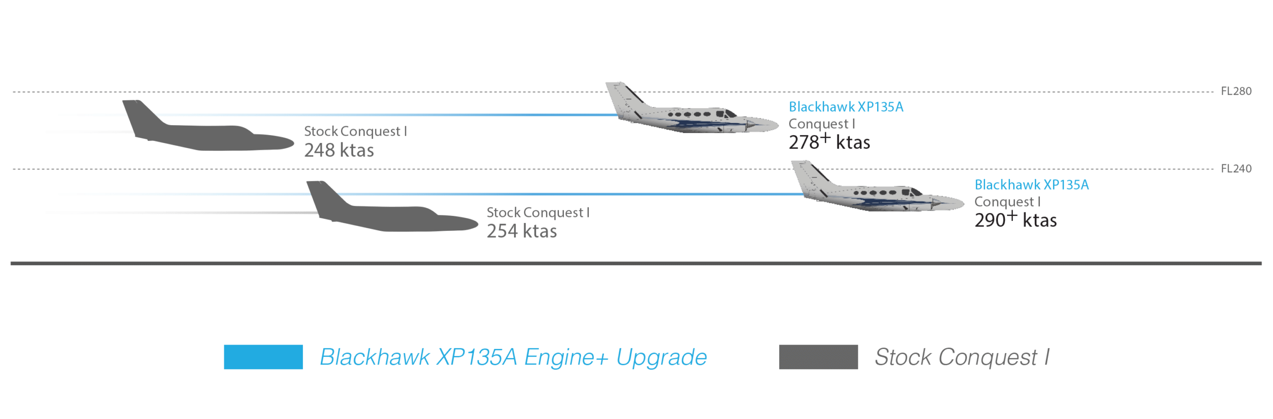 The Blackhawk XP135A Engine+ Upgrade for your Conquest boosts performance, increases reliability, raises your safety margin, and provides a significant return on investment over original PT6A-112 engines. Stock engines are exchanged for factory-new Pratt & Whitney Canada PT6A-135A engines, complete with new engine reliability and a new engine warranty without any airframe modification – giving you instantaneous extra horsepower for faster climb rates, cruise speeds, and time to destination.